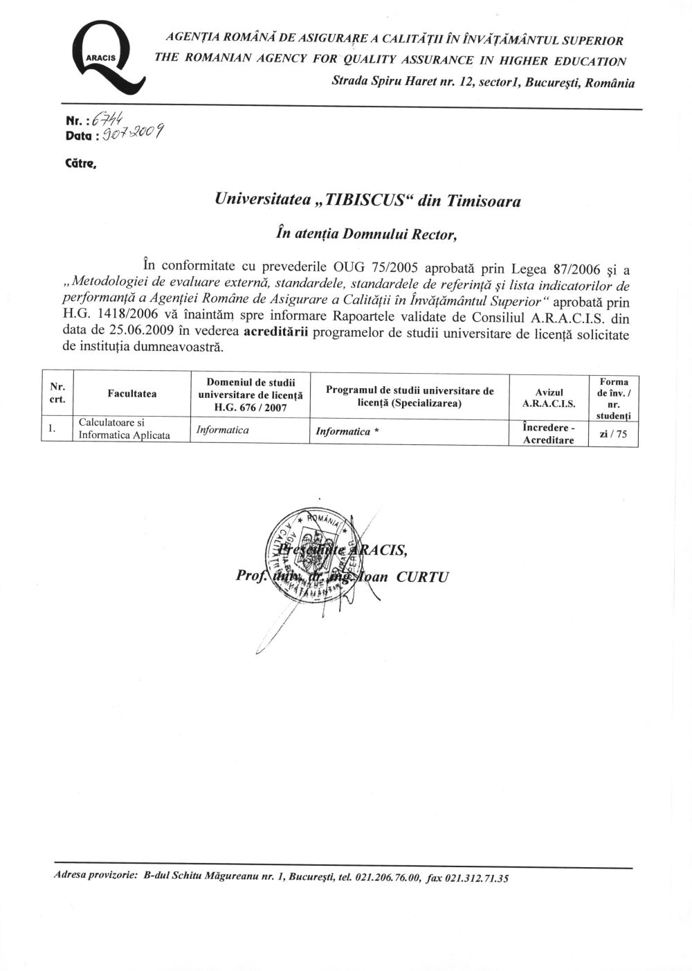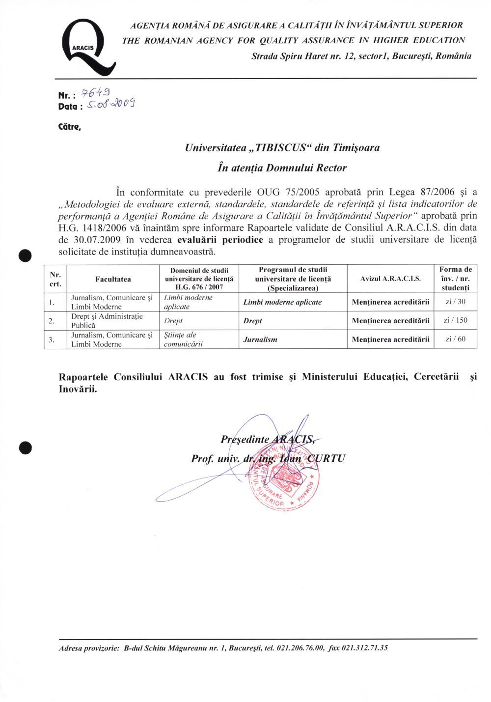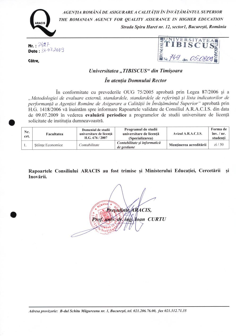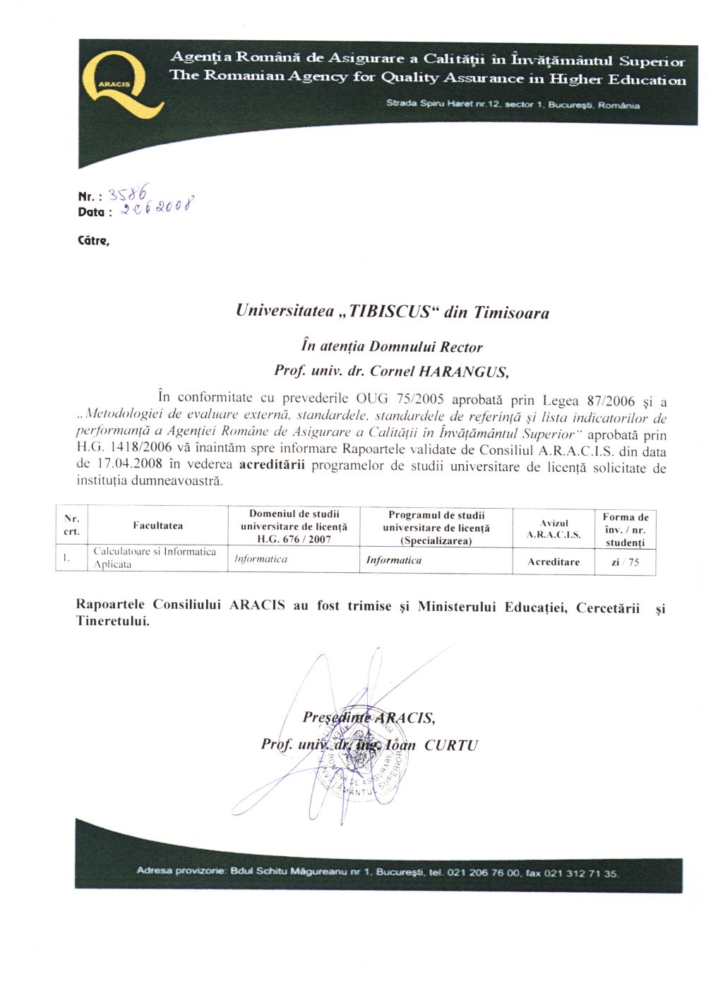 Studii universitare de licenţă Specializare: -acreditat prin Raportul nr. 1302/06.06.2000 al Consiliului Naţional de Evaluare Academică şi Acreditare -menţinerea acreditării prin Raportul nr. 7427/31.07.2009 al Agenţiei Române de Asigurare a Calităţii în Învăţământul Superior -autorizat prin Raportul nr. 2164/31.10.2005 al Consiliului Naţional de Evaluare Academică şi Acreditare -acreditat cu calificativul Încredere prin Raportul nr. 6343/16.06.2011 al Agenţiei Române de Asigurare a Calităţii în Învăţământul Superior |
