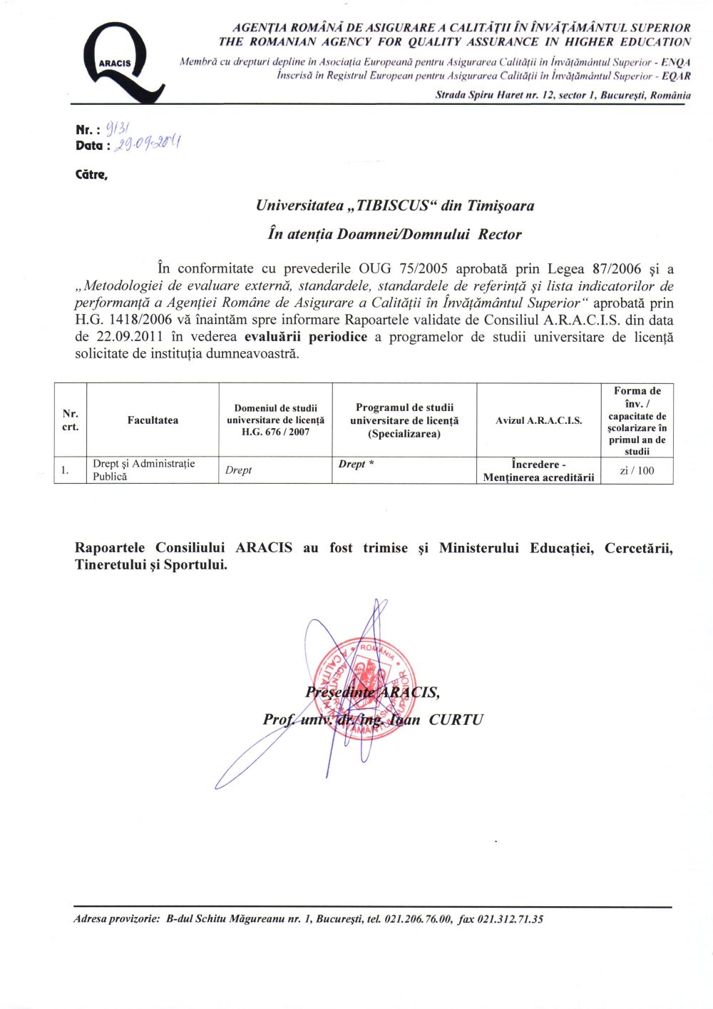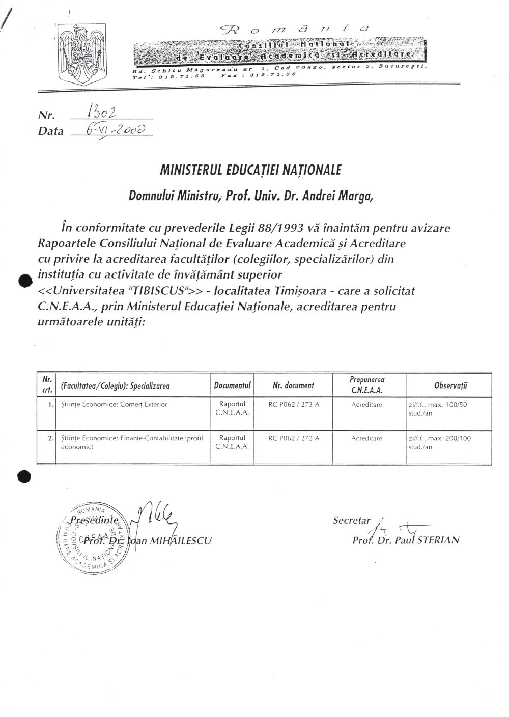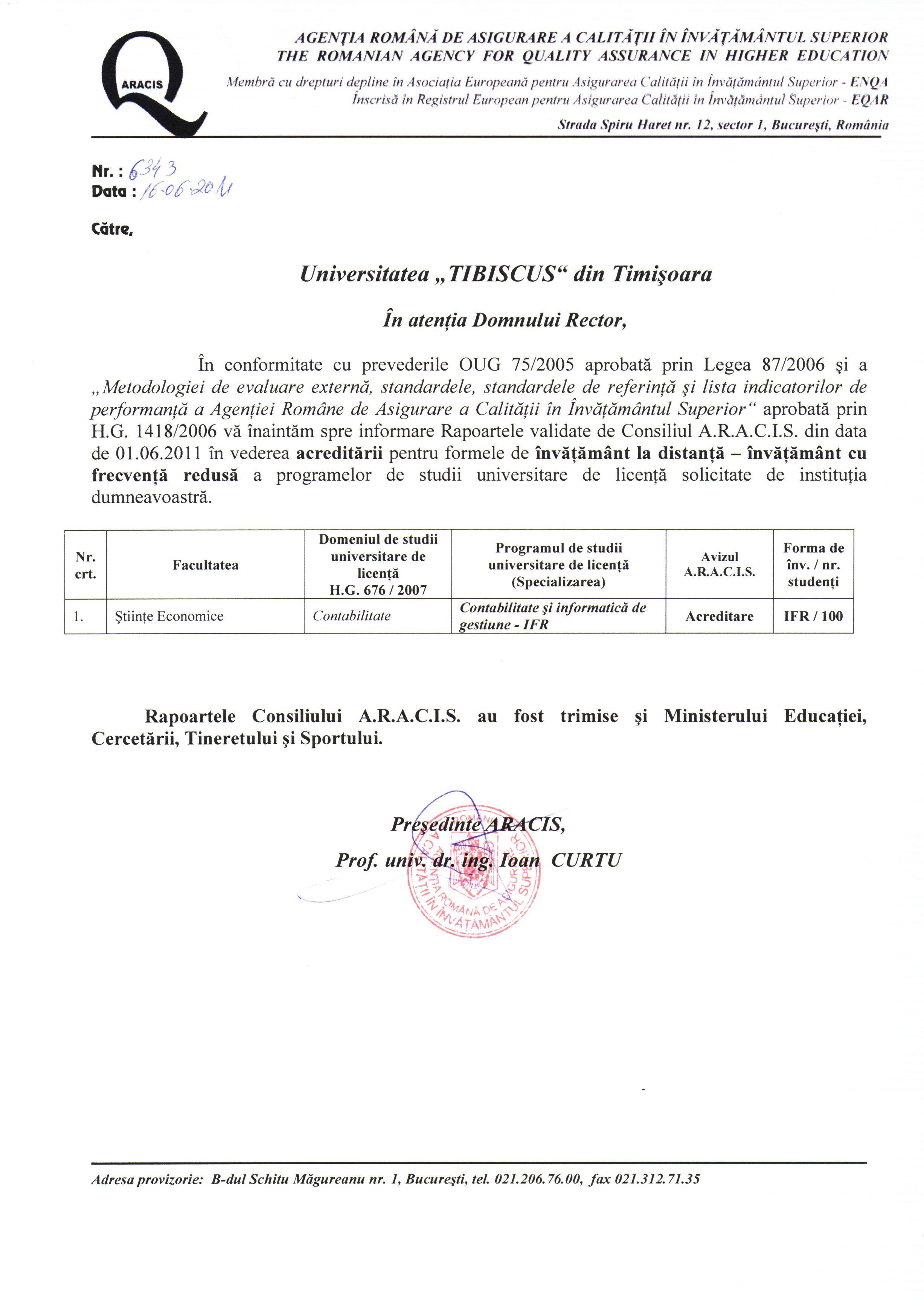 Studii universitare de licenţă Specializare: -acreditat prin Raportul nr. 1302/06.06.2000 al Consiliului Naţional de Evaluare Academică şi Acreditare -menţinerea acreditării prin Raportul nr. 7427/31.07.2009 al Agenţiei Române de Asigurare a Calităţii în Învăţământul Superior -autorizat prin Raportul nr. 2164/31.10.2005 al Consiliului Naţional de Evaluare Academică şi Acreditare -acreditat cu calificativul Încredere prin Raportul nr. 6343/16.06.2011 al Agenţiei Române de Asigurare a Calităţii în Învăţământul Superior |