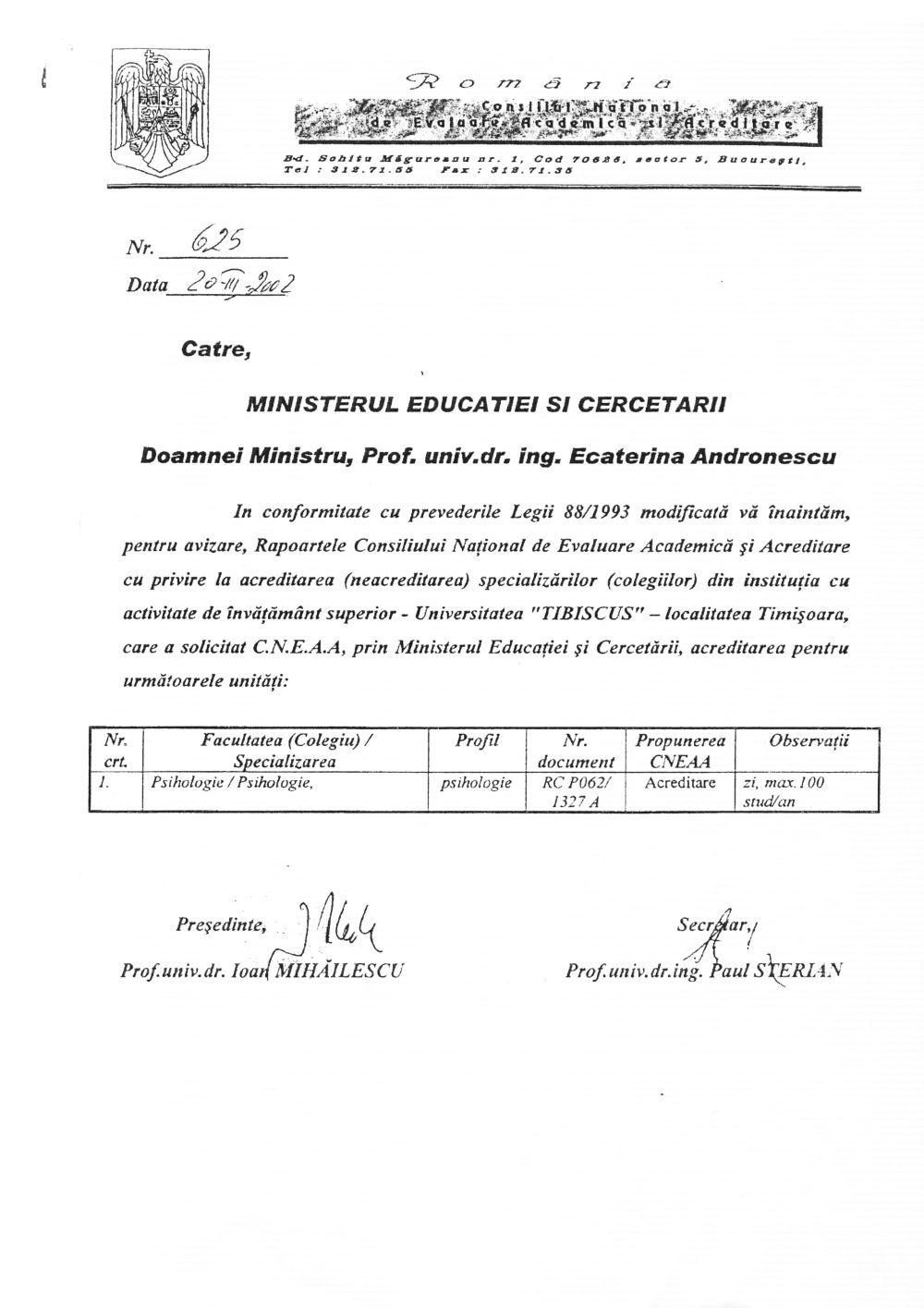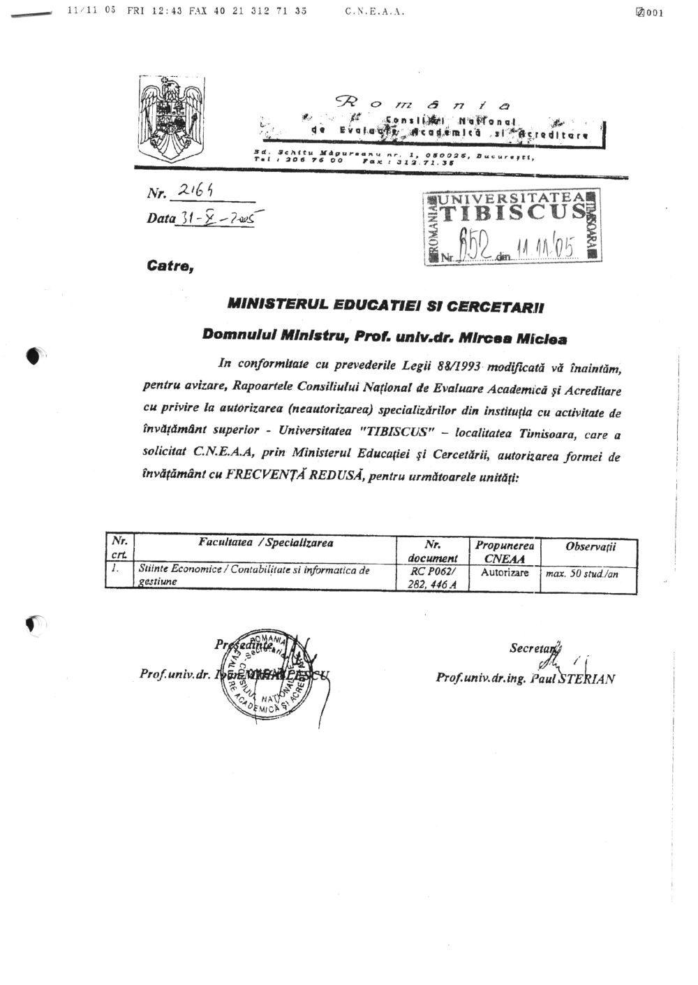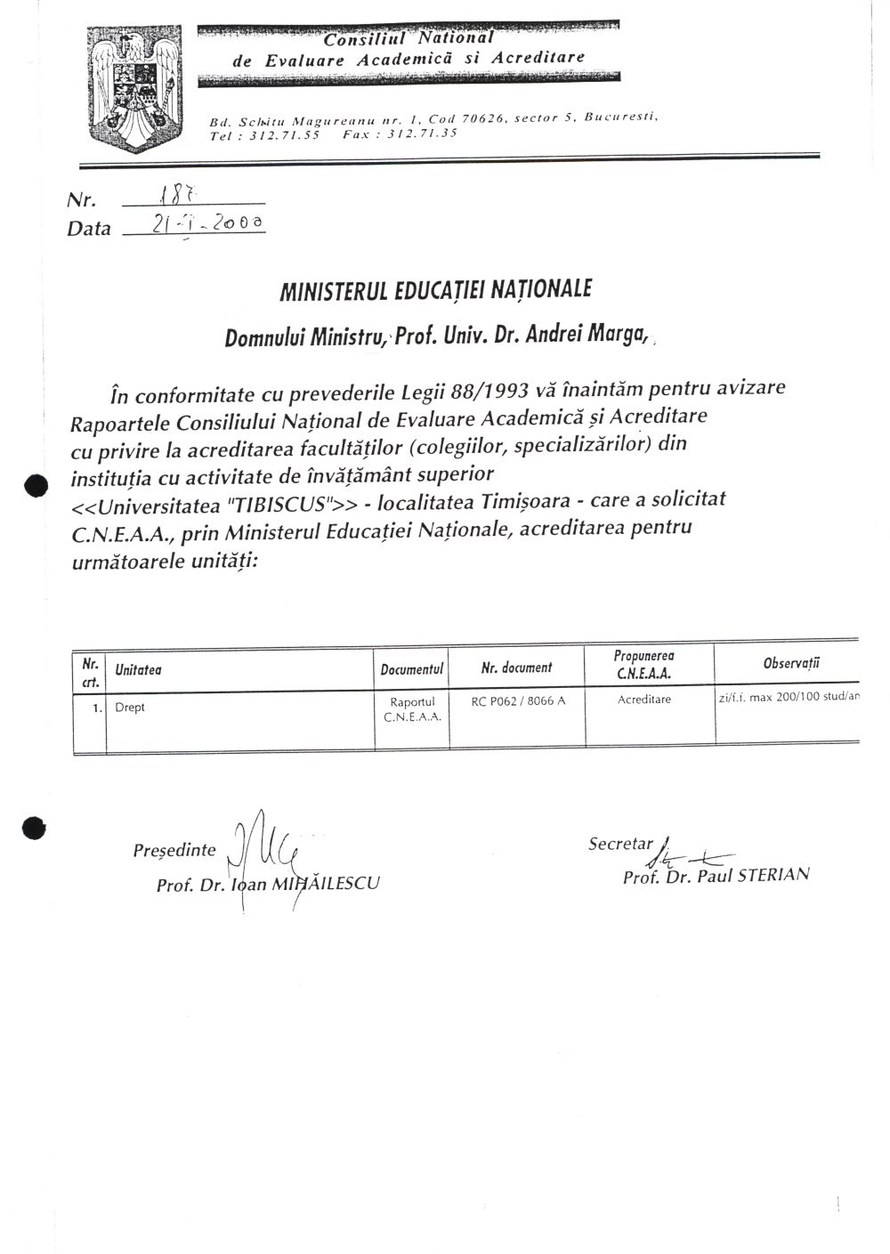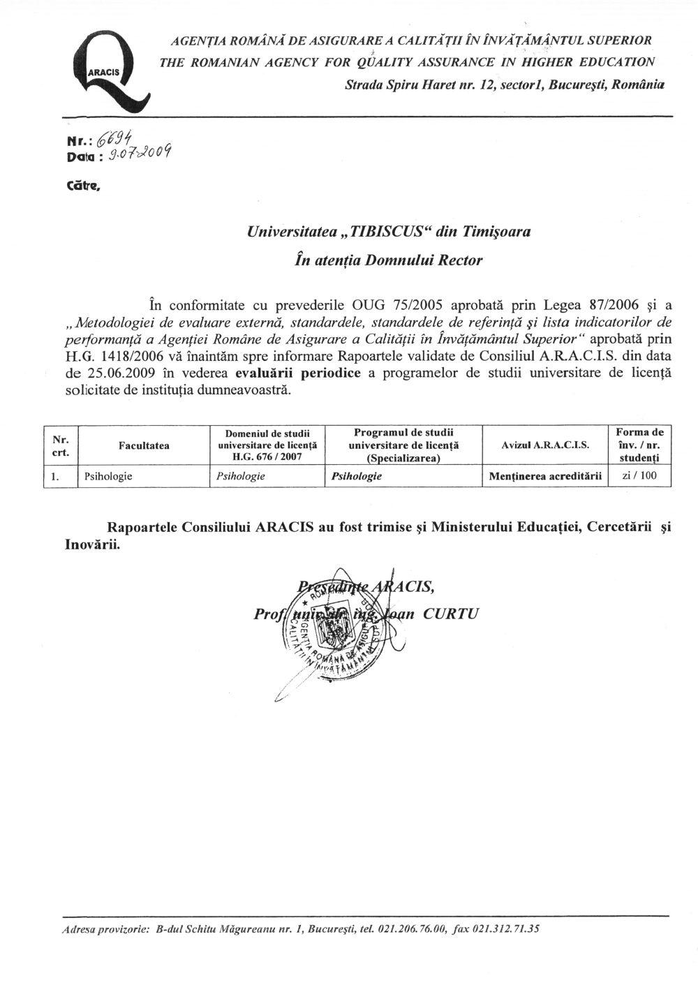 Studii universitare de licenţă Specializare: -acreditat prin Raportul nr. 1302/06.06.2000 al Consiliului Naţional de Evaluare Academică şi Acreditare -menţinerea acreditării prin Raportul nr. 7427/31.07.2009 al Agenţiei Române de Asigurare a Calităţii în Învăţământul Superior -autorizat prin Raportul nr. 2164/31.10.2005 al Consiliului Naţional de Evaluare Academică şi Acreditare -acreditat cu calificativul Încredere prin Raportul nr. 6343/16.06.2011 al Agenţiei Române de Asigurare a Calităţii în Învăţământul Superior |