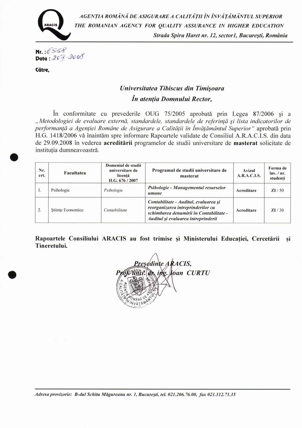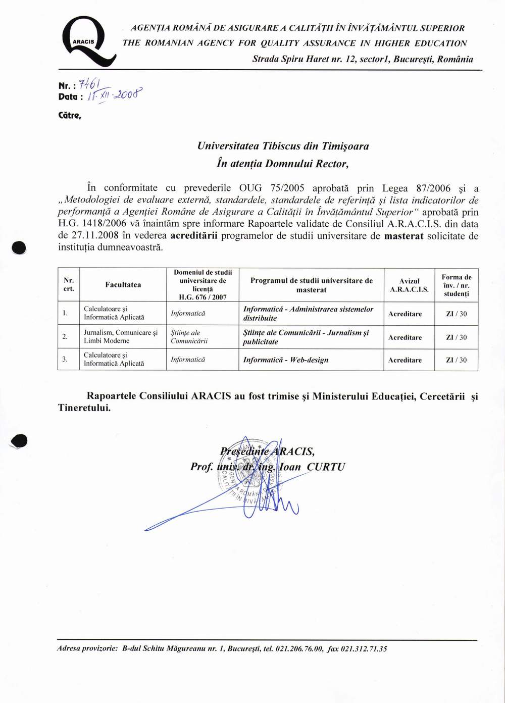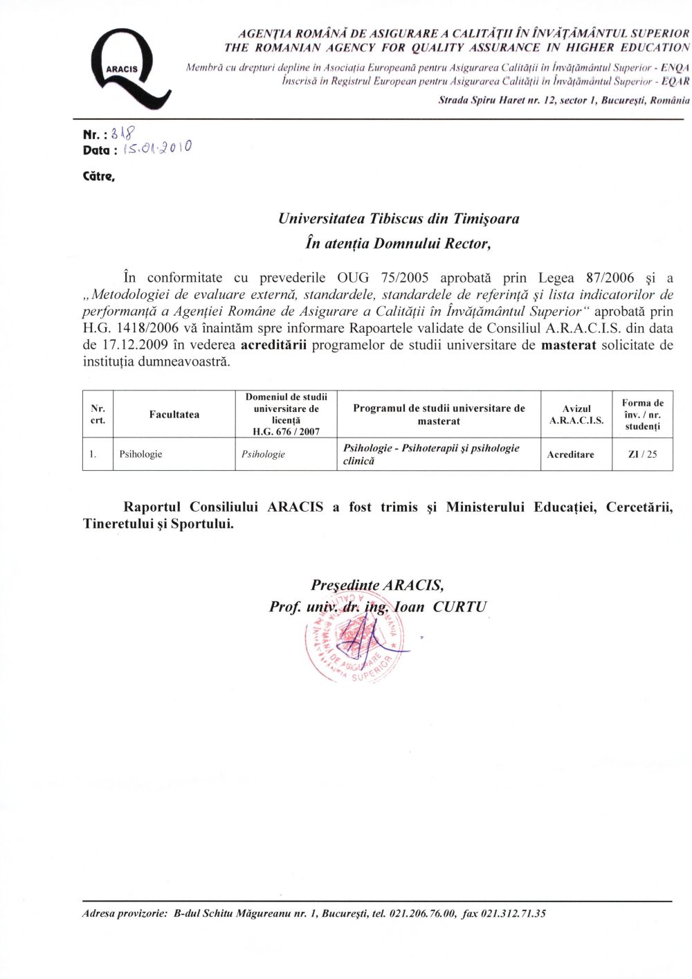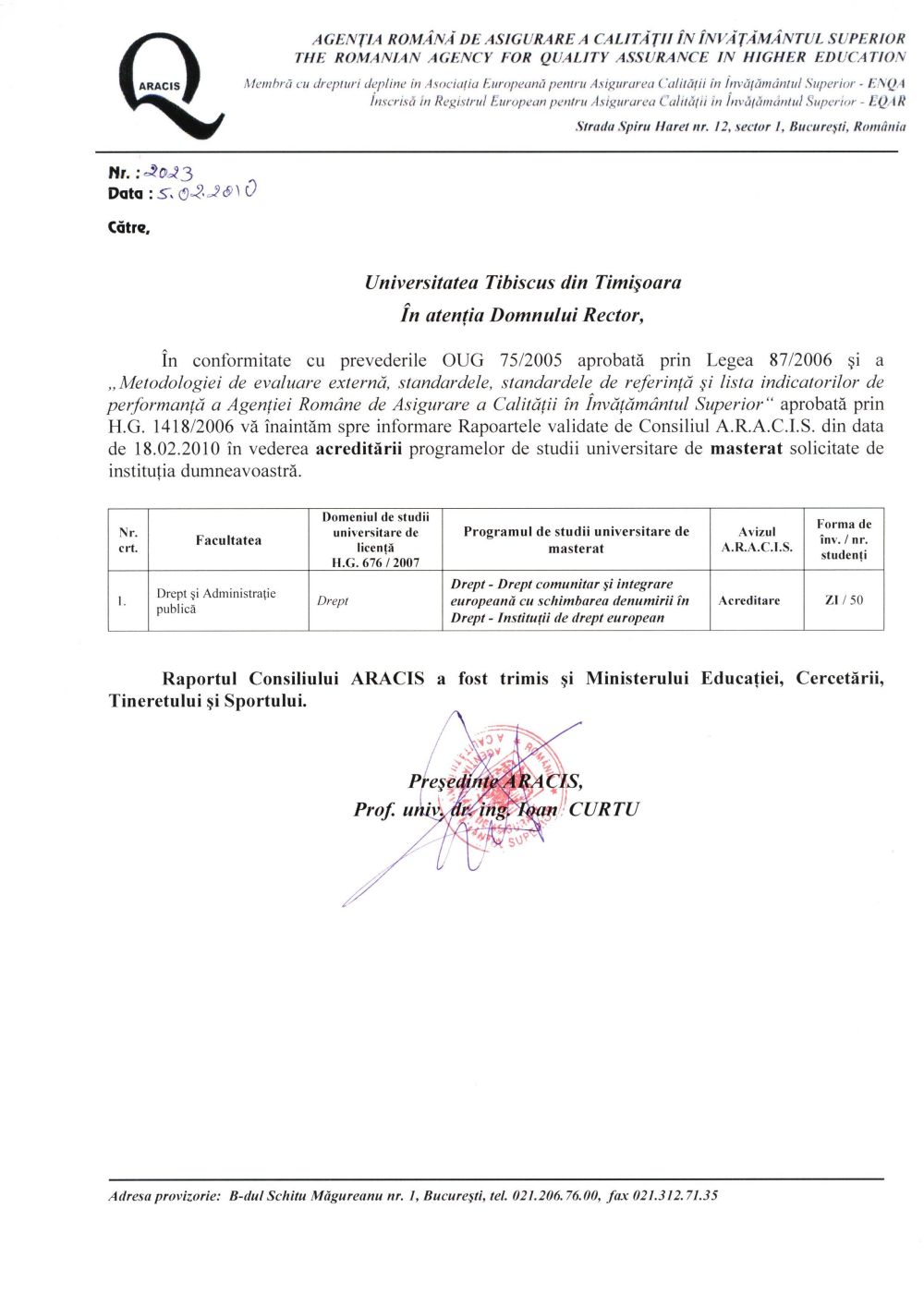 Studii universitare de masterat Program de studiu: -acreditat prin Raportul nr. 2023/05.02.2010 al Agenţiei Române de Asigurare a Calităţii în Învăţământul Superior |